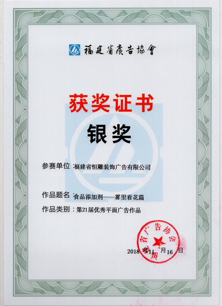 公司不断提升广告策划及创意设计水平,广告策划师创作的“雾里看花篇”广告作品荣获全省平面广告作品银奖。福建省第二十一届优秀广告作品大赛,组织专家、学者、业界骨干组成评选委员会,对全省600多件作品依照公开、公平、公正的程序进行评审。
