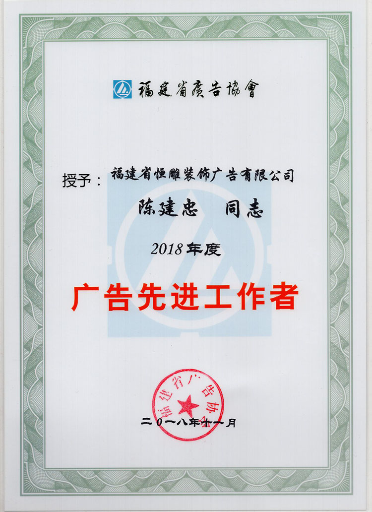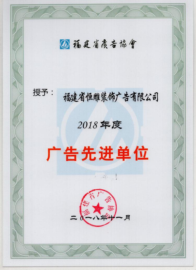 2018年,福建省恒雕装饰广告有限公司不忘初心、锐意进取,在广告经营活动中,诚信守约、严格管理,不断健全企业管理制度,在行业内获得较高声誉与威望。为此福建省广告协会授予福建省恒雕装饰广告有限公司“2018年度广告先进单位”荣誉。