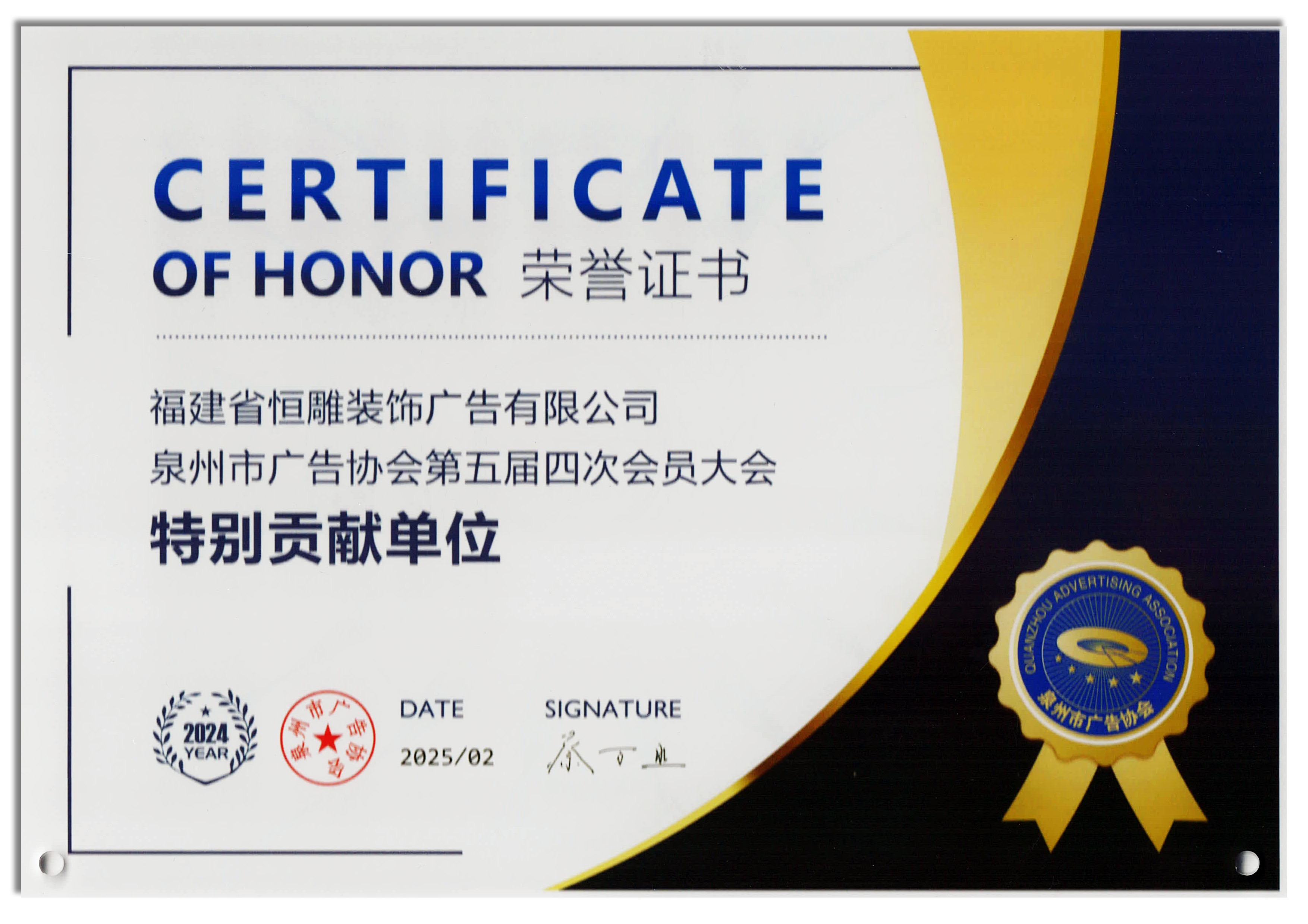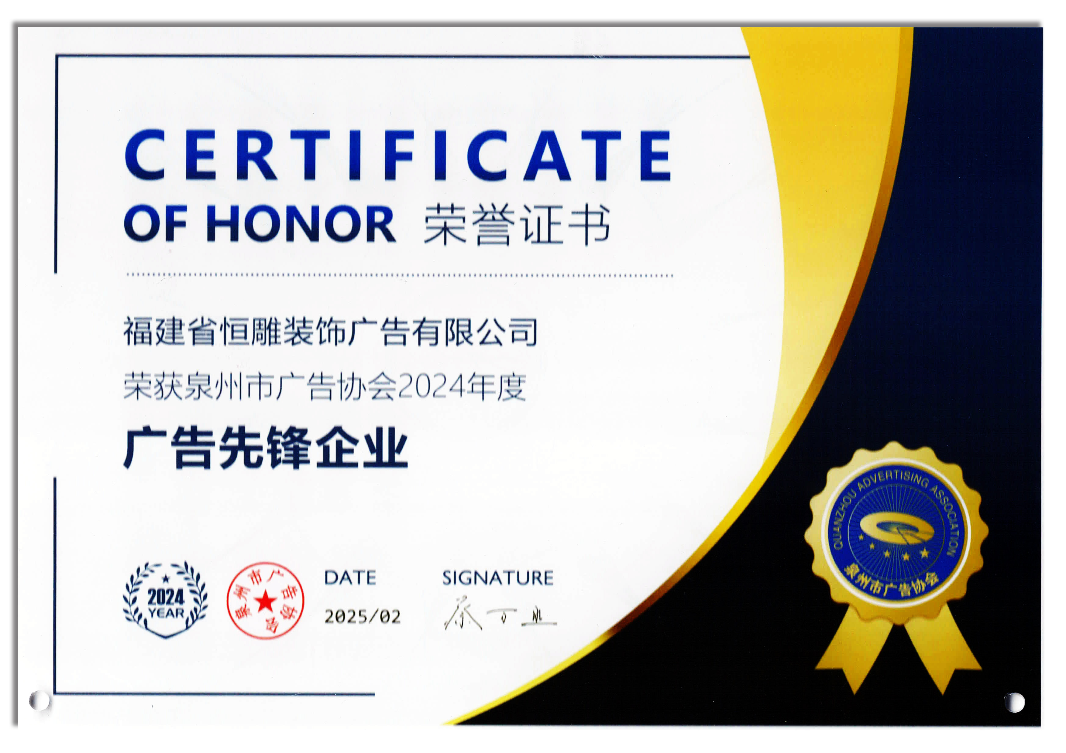2025年2月,福建省恒雕装饰广告有限公司获评泉州市广告协会颁发2024年度“广告先锋企业”“特别贡献单位”等荣誉。公司近年来在商业服务广告领域深耕发展,开拓多元化广告业务,中标承接大型雕塑、美陈、标识等多项文化艺术工程,提供更多工作岗位,大幅提升公司服务类营业业绩。